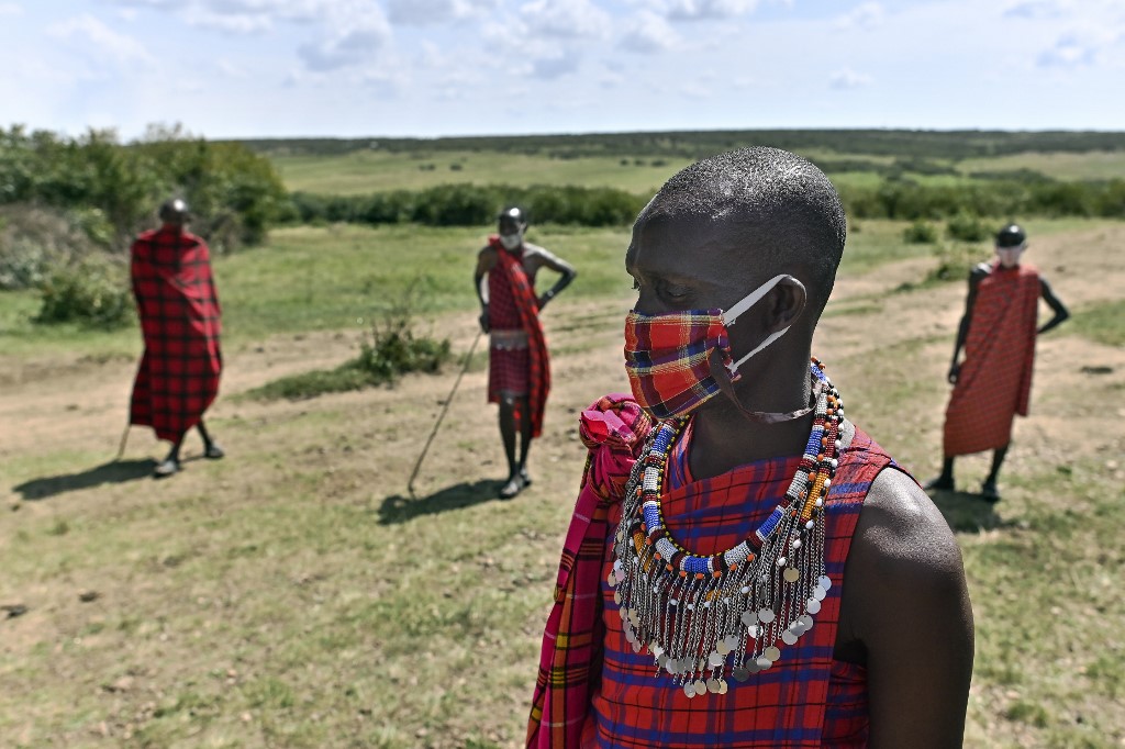 KENYA TOURISM. Cultural performers from the Maasai tribe gather outside their manyatta (village) in Talek in the Maasai Mara National Reserve, where their work of performing for visiting tourists has dwindled, on June 24, 2020. Photo by Tony Karumba/AFP