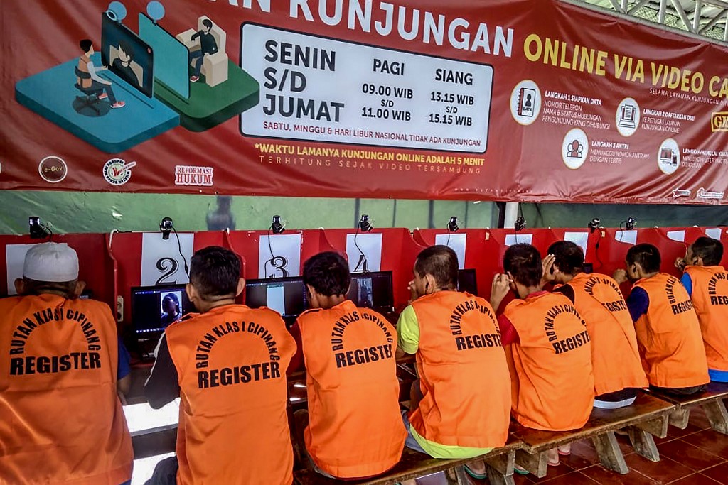 ONLINE CALLS. This handout photo taken and released by the Indonesian Ministry of Law and Human Rights on March 31, 2020 shows inmates receiving online calls from their families in Jakarta, following the government's request for social distancing amid the concerns over the spread of the COVID-19 coronavirus. AFP PHOTO/Indonesian Ministry of Law and Human Rights